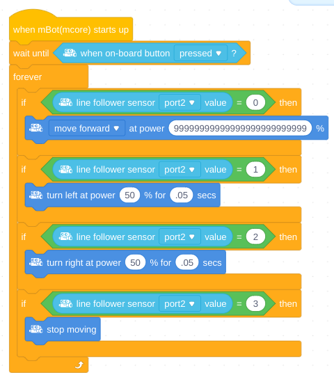 Today at tech for robotics, we learnt about using infared sensors, to code our M bot to follow the line. We were making our mbots follow the line shape of the figure 8. We also went over the Binary learning we did last week, this is the way robots, computers and other technology work. I first started by choosing the code blocks I needed, they were the most important ones in the photo above, But before we did our task we made sure our M bots were working like making sure the M bots wheel's were tight enough and not loose.